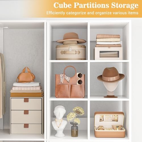 Maximize storage with our thoughtful design, which includes four spacious drawers for folded clothes and accessories. The six-grid cubby is ideal for handbags or seasonal items, while a lower shoe area ensures your footwear stays organized and off the floor. Every inch of this closet system is crafted to enhance your storage without compromising on style.